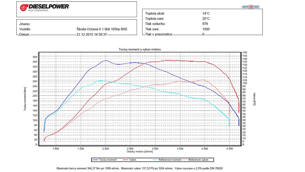 Nejprve provedeme vstupní diagnostiku vozu společně s dynamickou zkouškou výkonu na 4×4 válcové zkušebně DIESELPOWER. Následuje vyčtení sériových dat, jejich analýza včetně případné aktualizace na nejnovější softwarovou verzi. Poté přistoupíme k úpravě dat v řídící jednotce na míru Vašemu vozu, kterou završíme zkouškou na válcové zkušebně pro ověření parametrů. Po pečlivém odladění, zohledňujícím zachování maximální bezpečnosti a spolehlivosti vozu, bylo u tohoto vozidla dosaženo konečných 137 PS a 346 Nm.